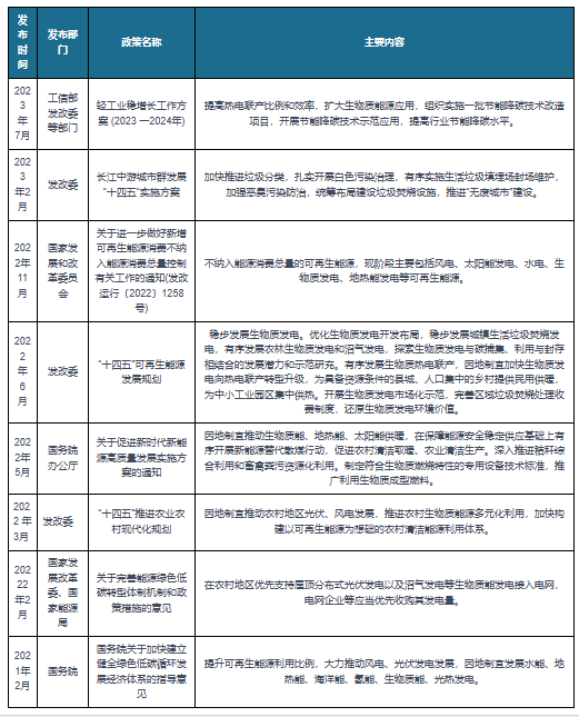 近些年來,為了緩解能源短缺,有效利用可再生能源,我國各部門紛紛出台了一係列政策,如2023年7月工信部發改委等部門發布的《輕工業穩增長工作方案 (2023一2024年)》,提到提高熱電聯產比例和效率,擴大生物質能源應用,組織實施一批節能降碳技術改造項目,開展節能降碳技術示範應用,提高行業節能降碳水平。